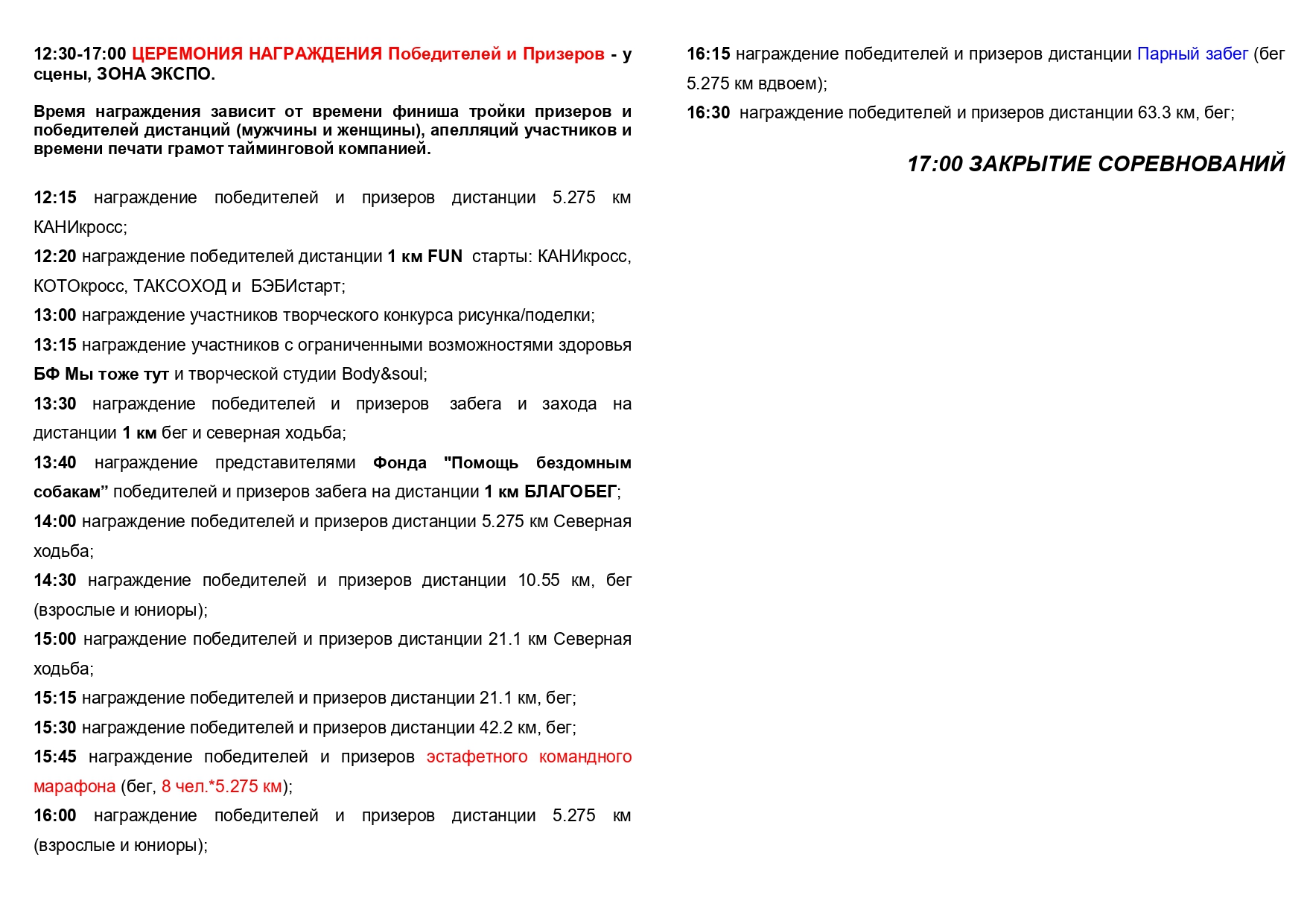 15:45 награждение победителей и призеров эстафетного командного марафона (бег, 8*5,275 км = 42.2 км);