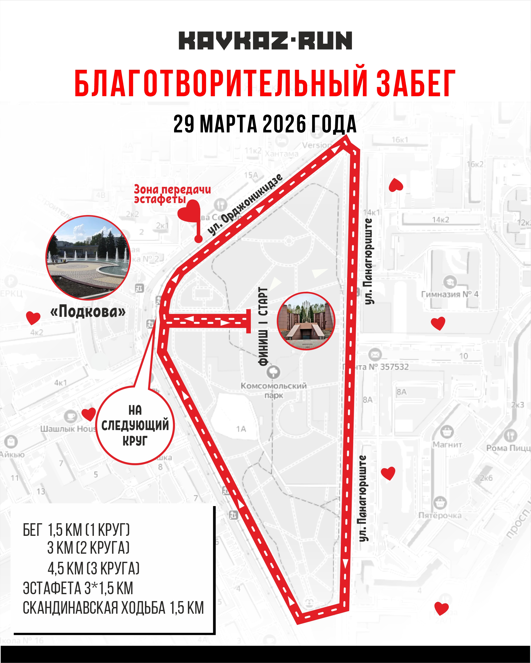 Праздник состоится в Комсомольском парке в городе Пятигорск. Участники смогут пробежать самостоятельно 1,5 км, 3 км, 4,5 км или преодолеть дистанцию скандинавской ходьбой, а так же принять участие в формате эстафеты 3*1,5 км.