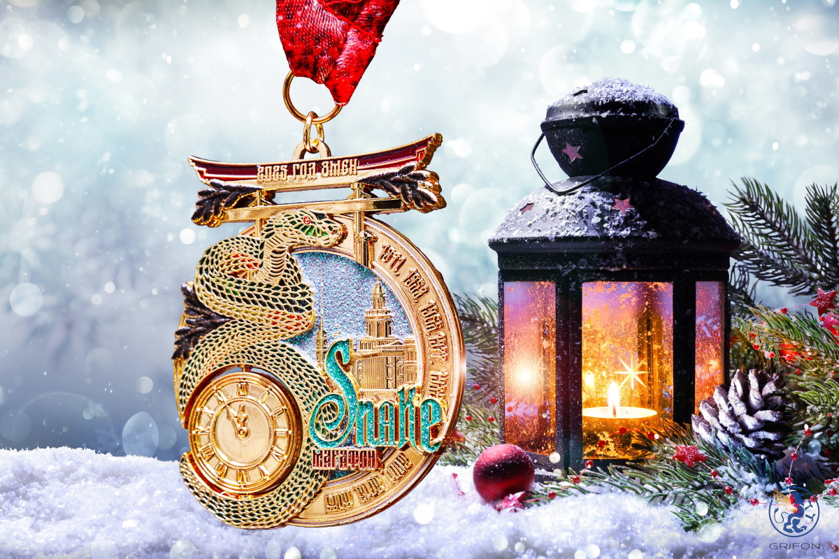 Медаль финишера Новогоднего Марафона традиционно новогодняя, сказочная. 2025 год- год Змеи по восточному календарю, что отражено в медали.
