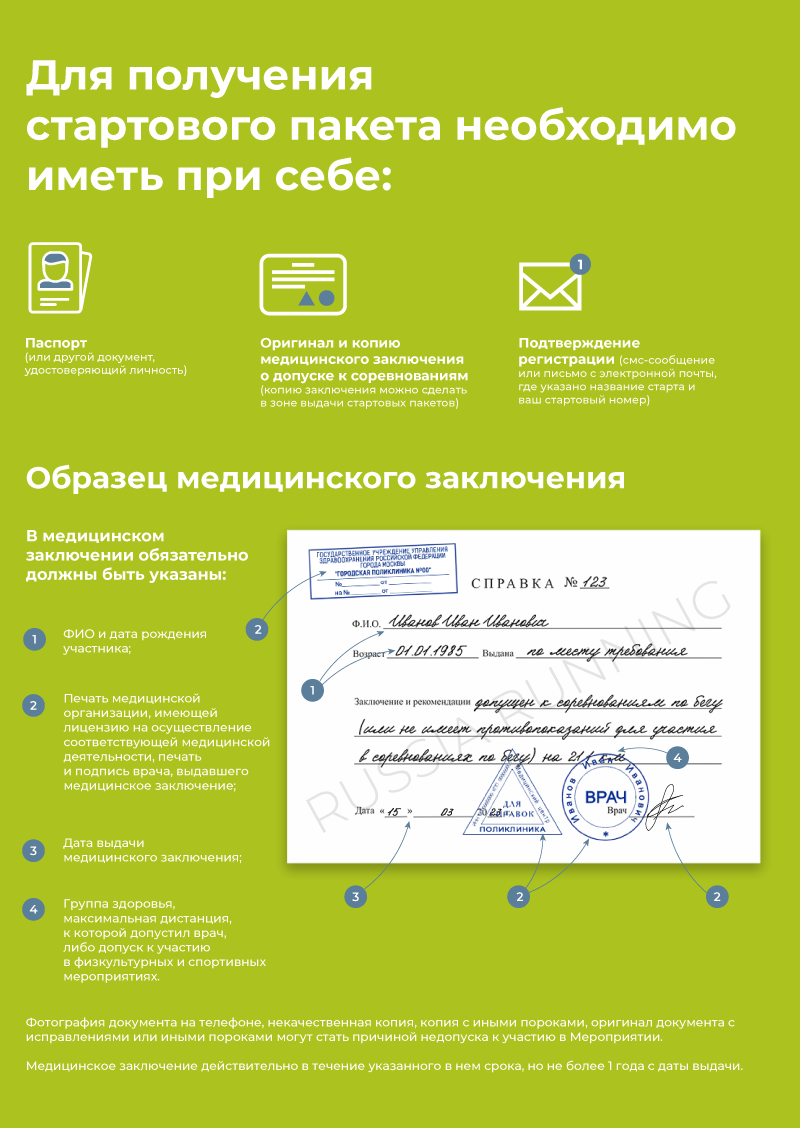 Участвовать в беговых событиях можно только с разрешения врача. Для допуска к старту на любой дистанции необходимо предъявить оригинал или копию (при наличии оригинала) медицинского заключения, оформленного в соответствии с приказом Министерства здравоохранения РФ от 23.10.2020 №1144н и других форм медицинских заключений о допуске к участию физкультурных и спортивных мероприятиях.В медицинском заключении обязательно должны быть: