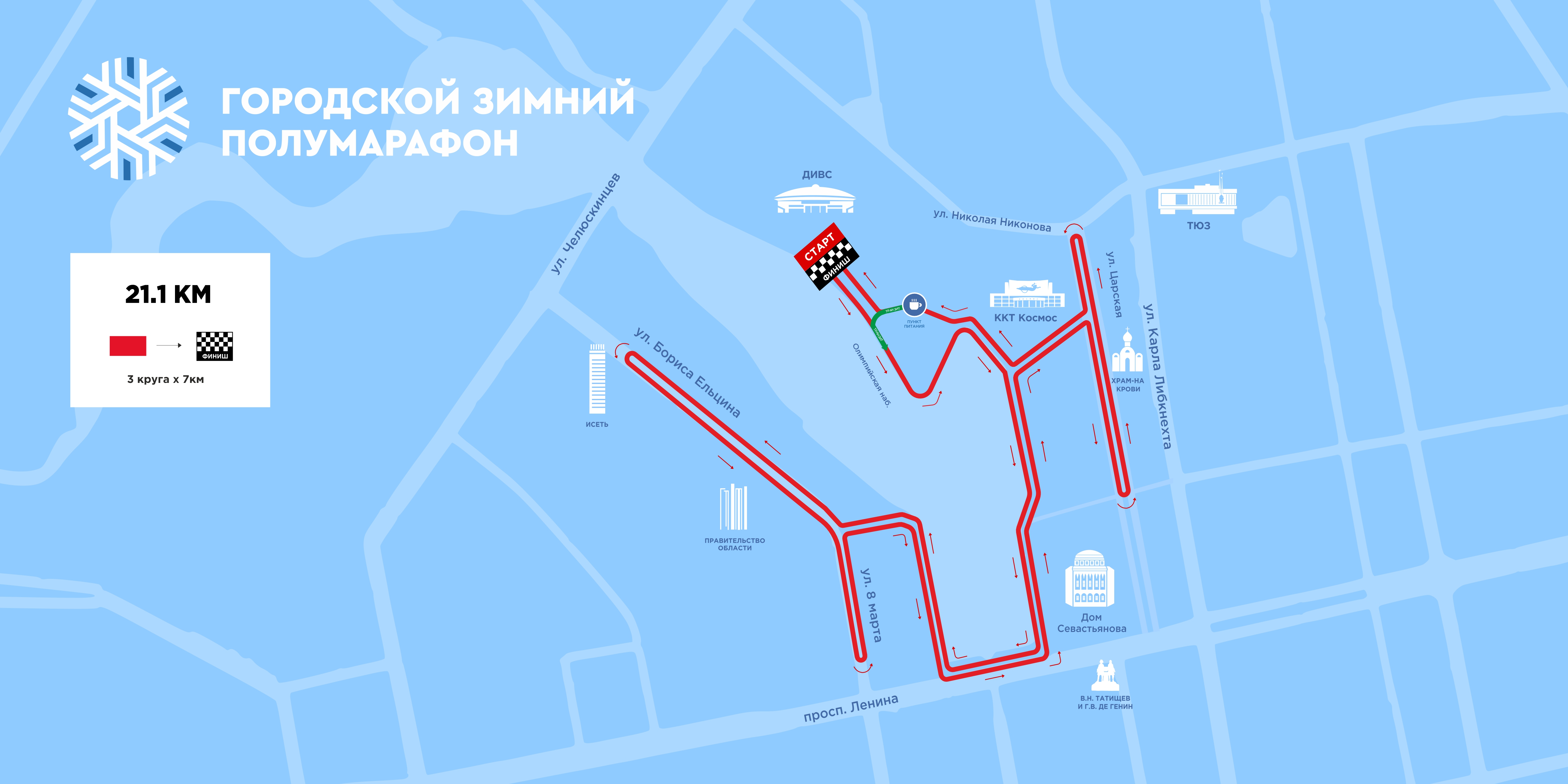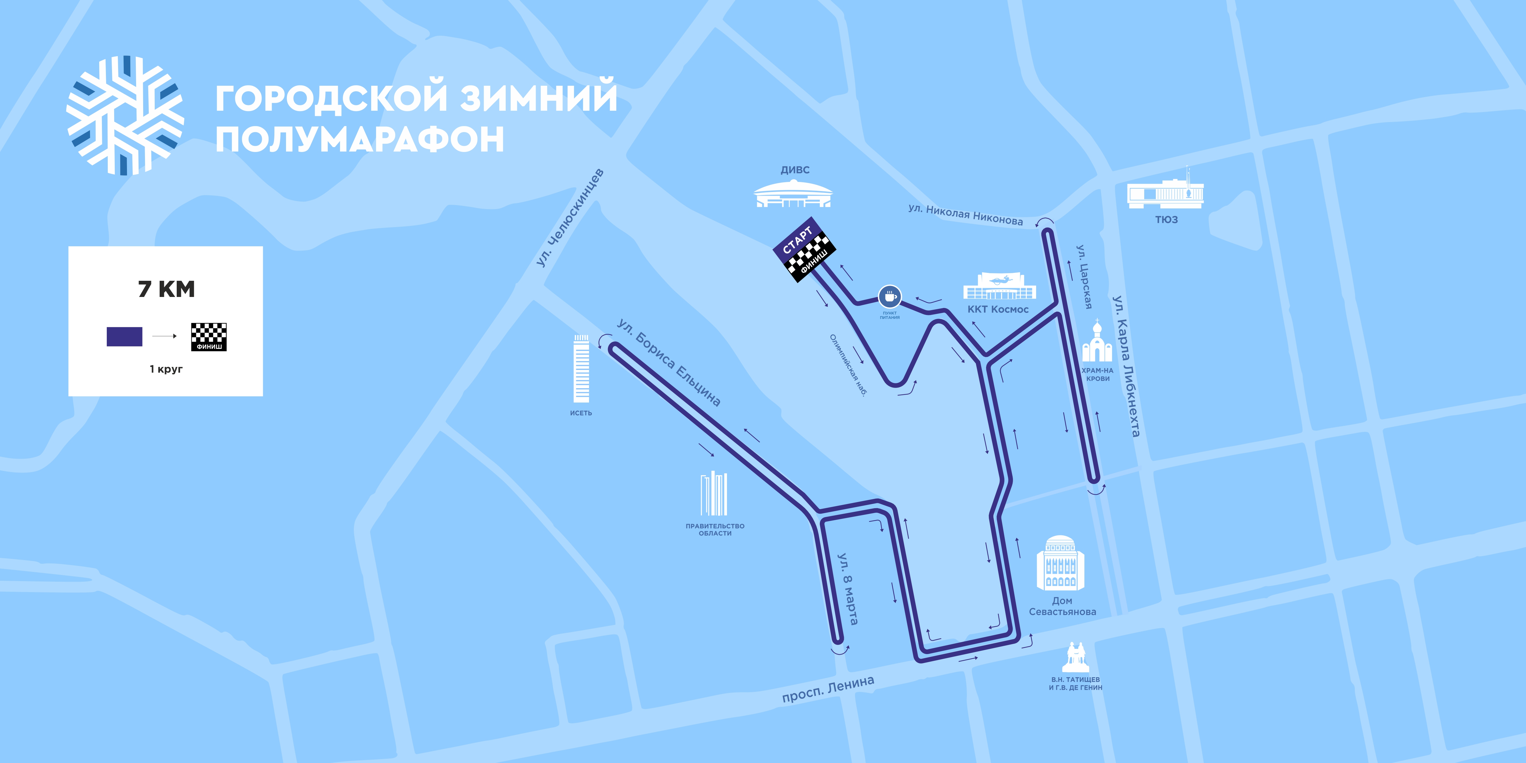 Участникам предлагается встретить зиму, 14 декабря, на бегу и испытать себя! Две дистанции на выбор: 7 км и 21.1км, а также детский забег для самых юных любителей бега. На точке питания предусмотрены тёплый чай и печенье.