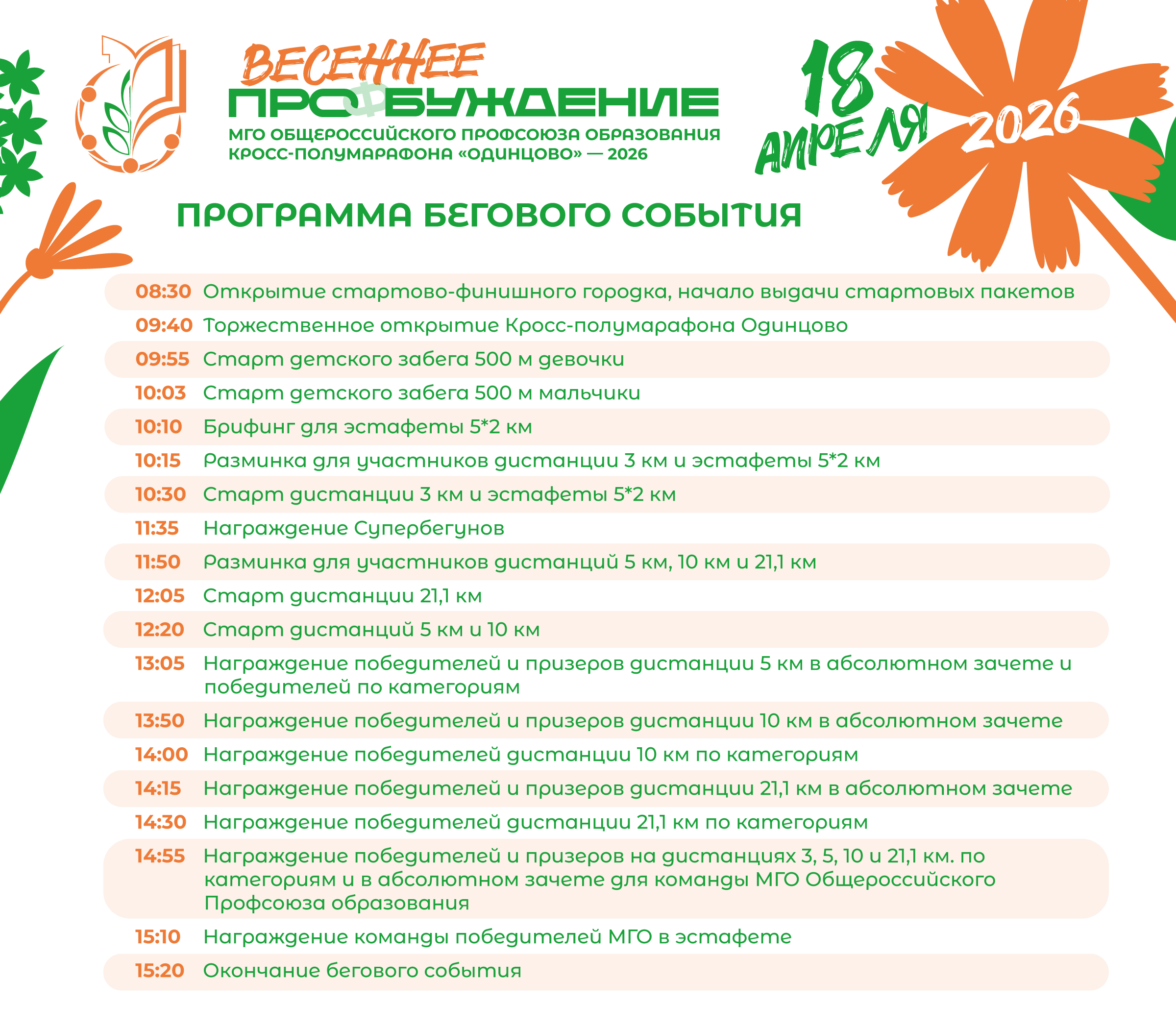 18 апреля в спортивном парке отдыха имени Героя России Ларисы Лазутиной в Одинцово пройдёт кросс-полумарафон с участием корпоративного забега для членов МГО Общероссийского профсоюза образования.