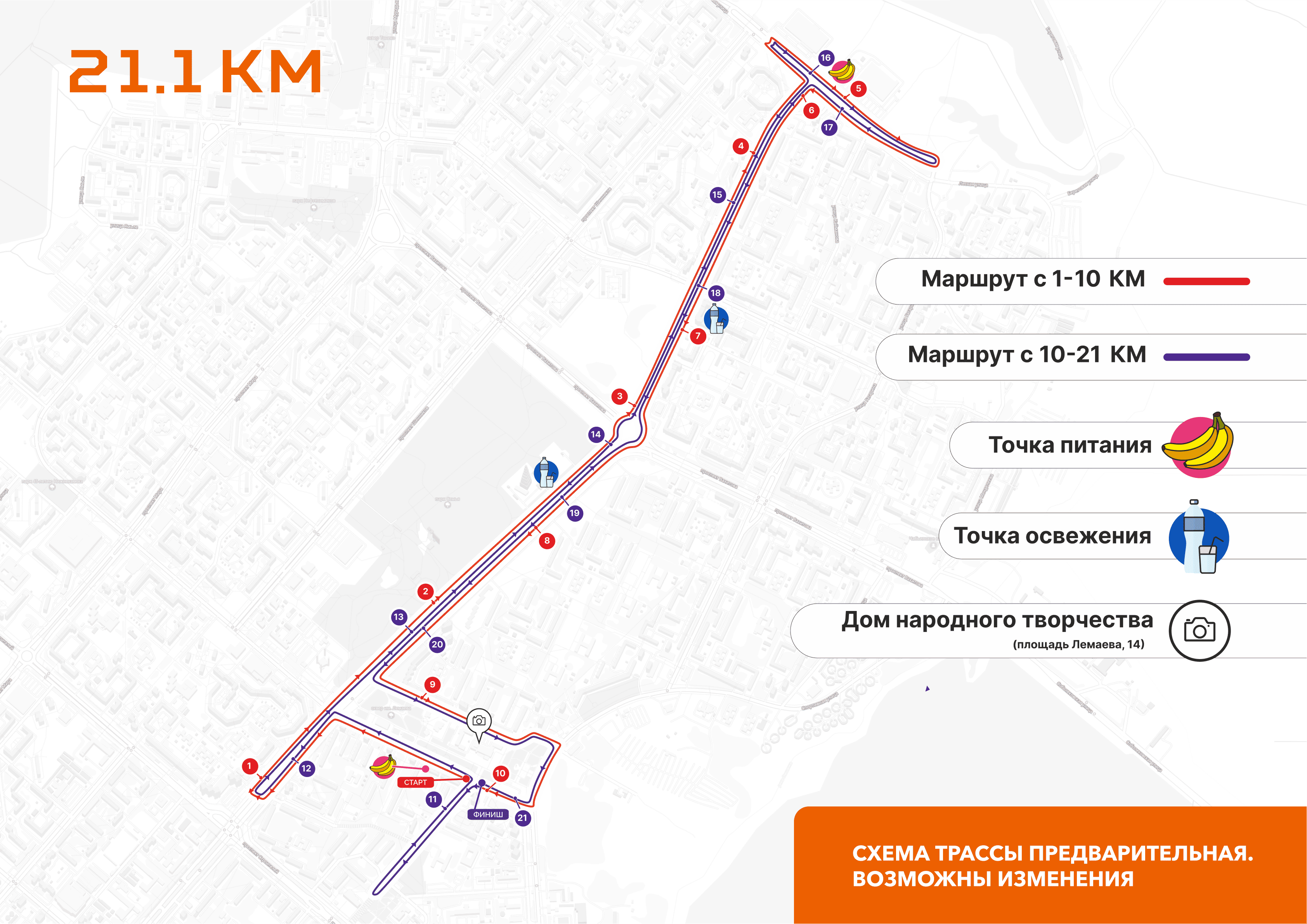 - 07:00 — 08:00 — Выдача стартовых пакетов зарегистрированным участникам 10 км, 21.1 км и TIMERKIDS