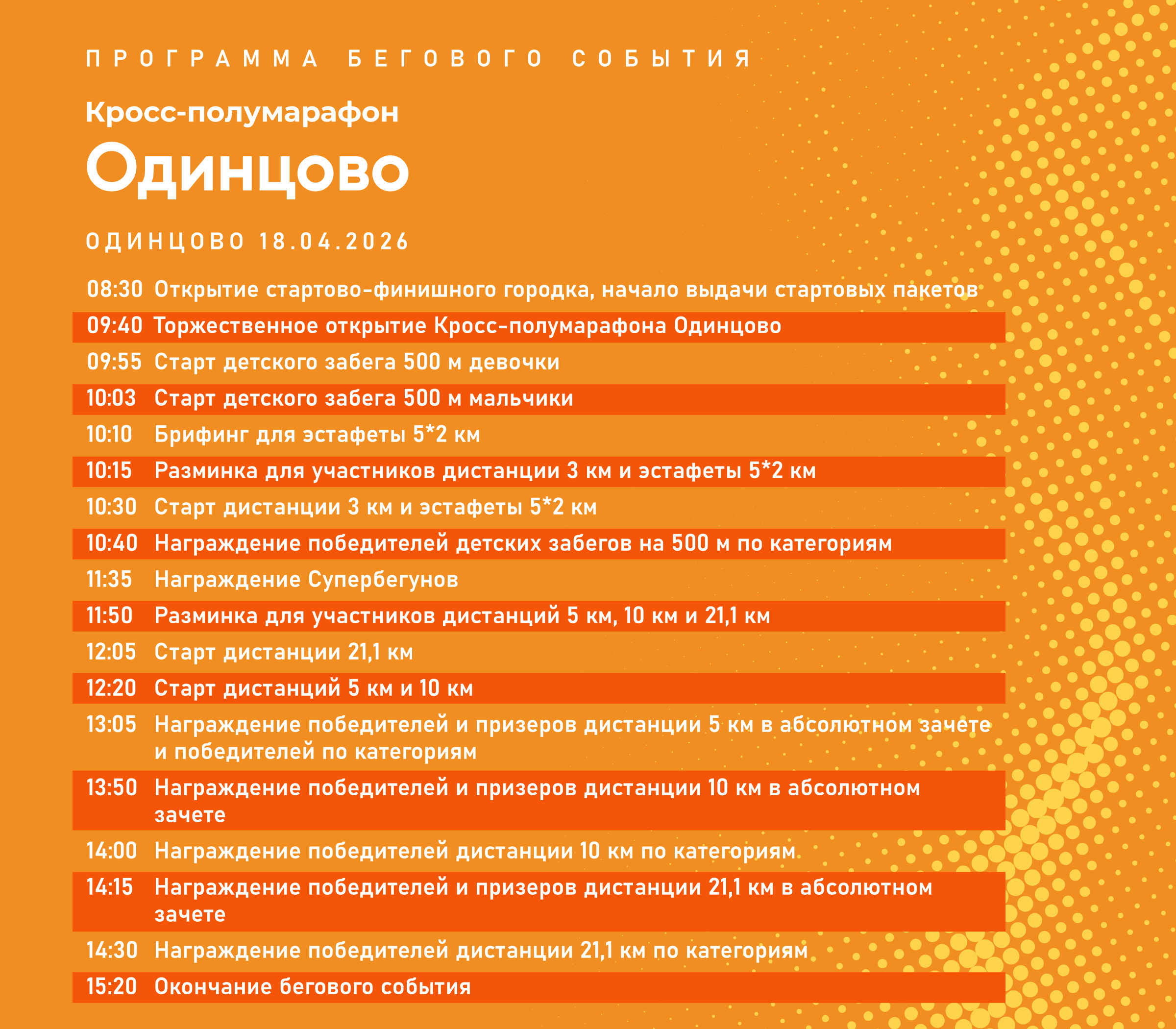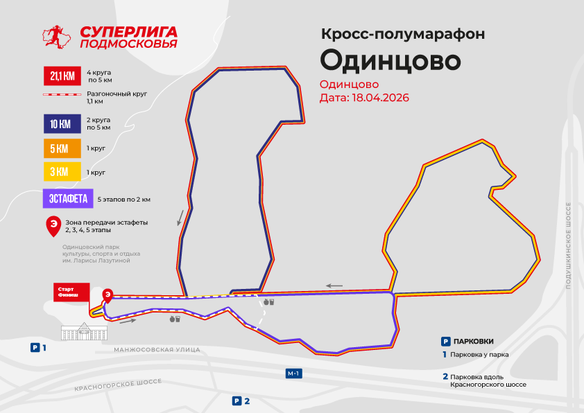 18 апреля в Одинцово откроется пятый сезон серии легкоатлетических забегов, которая реализуется в рамках проекта «Суперлига Подмосковья». Старт кросс-полумарафону «Одинцово» будет дан в Одинцовском парке культуры, спорта и отдыха им. Ларисы Лазутиной. Особенность этого бегового события — непростой рельеф трассы с разнообразным покрытием. Участники будут преодолевать дистанции по асфальту, грунту, дорожкам с мелким гравием и щепе. Также на их пути будут встречаться резкие спуски и подъёмы.