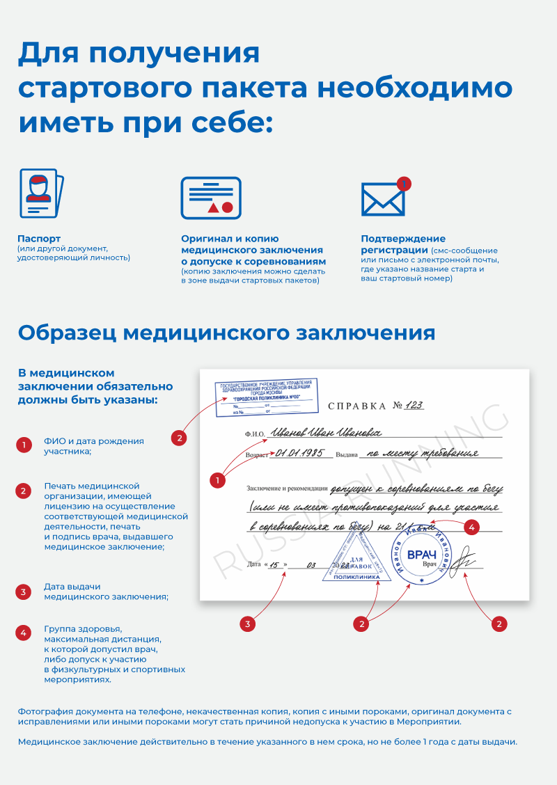 Участвовать в беговых событиях можно только с разрешения врача. Для допуска к старту на любой дистанции необходимо предъявить оригинал или копию (при наличии оригинала) медицинского заключения, оформленного в соответствии с приказом Министерства здравоохранения РФ от 23.10.2020 №1144н и других форм медицинских заключений о допуске к участию физкультурных и спортивных мероприятиях.В медицинском заключении обязательно должны быть: