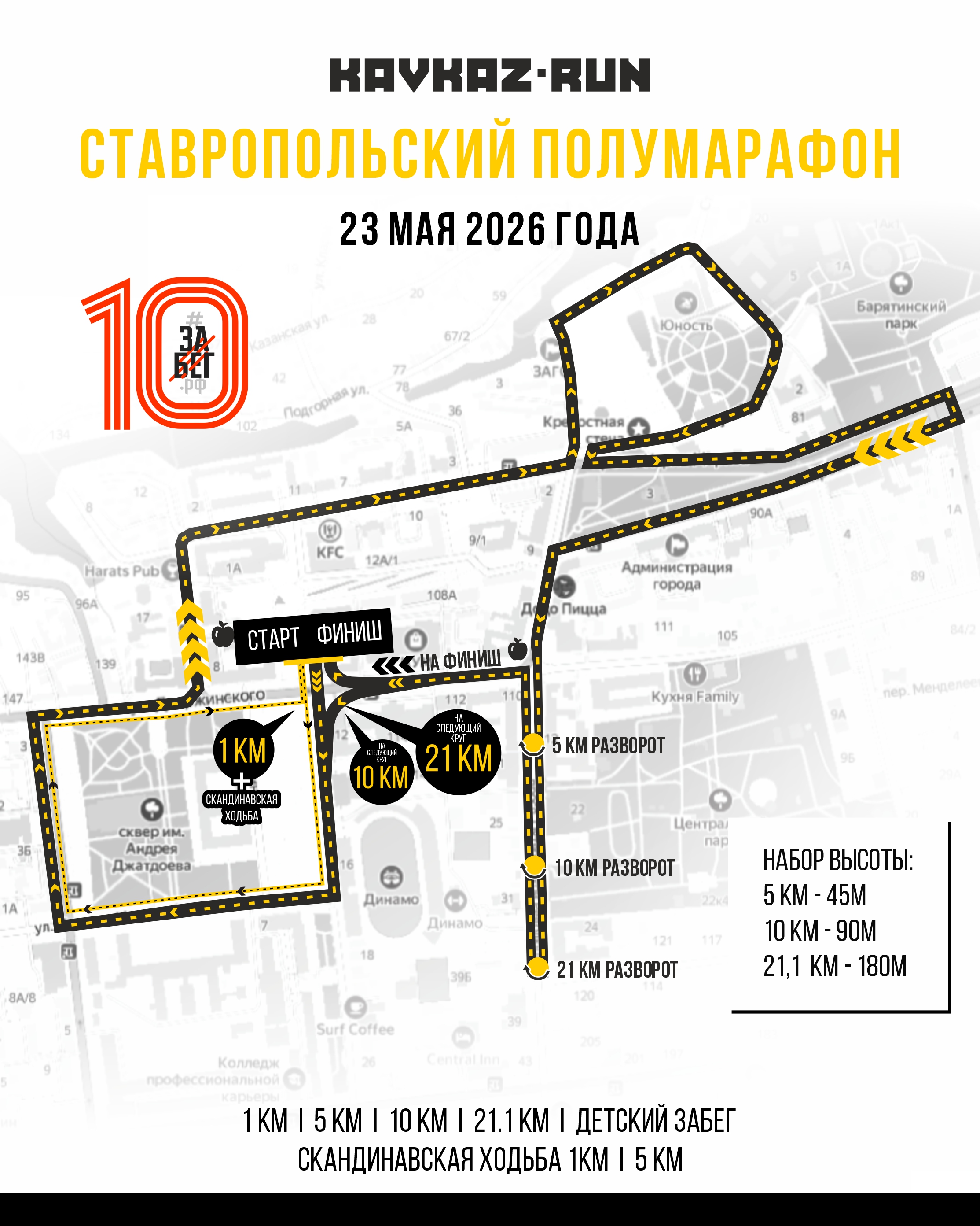 Стартово-финишный городок расположится на Александровской площади, а все маршруты пройдут по центральным улицам Ставрополя.