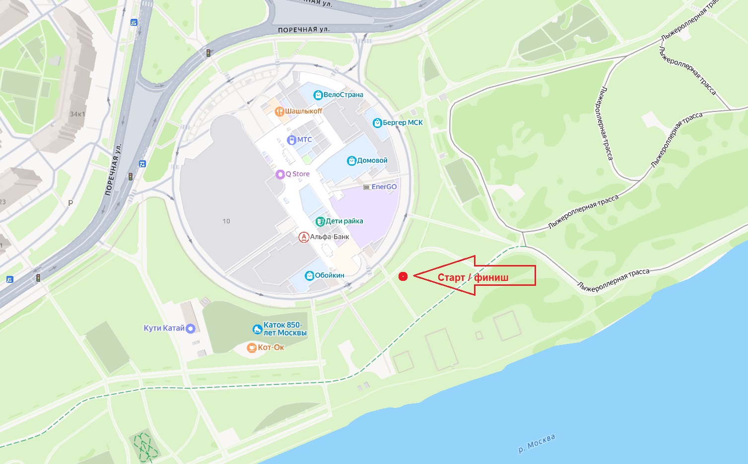 Стартовая зона расположена: вход в парк за ТРЦ "Мари" (ул. Поречная, д. 10). Парковочные места - в изобилии вокруг ТЦ "МАРИ" и вдоль парка.