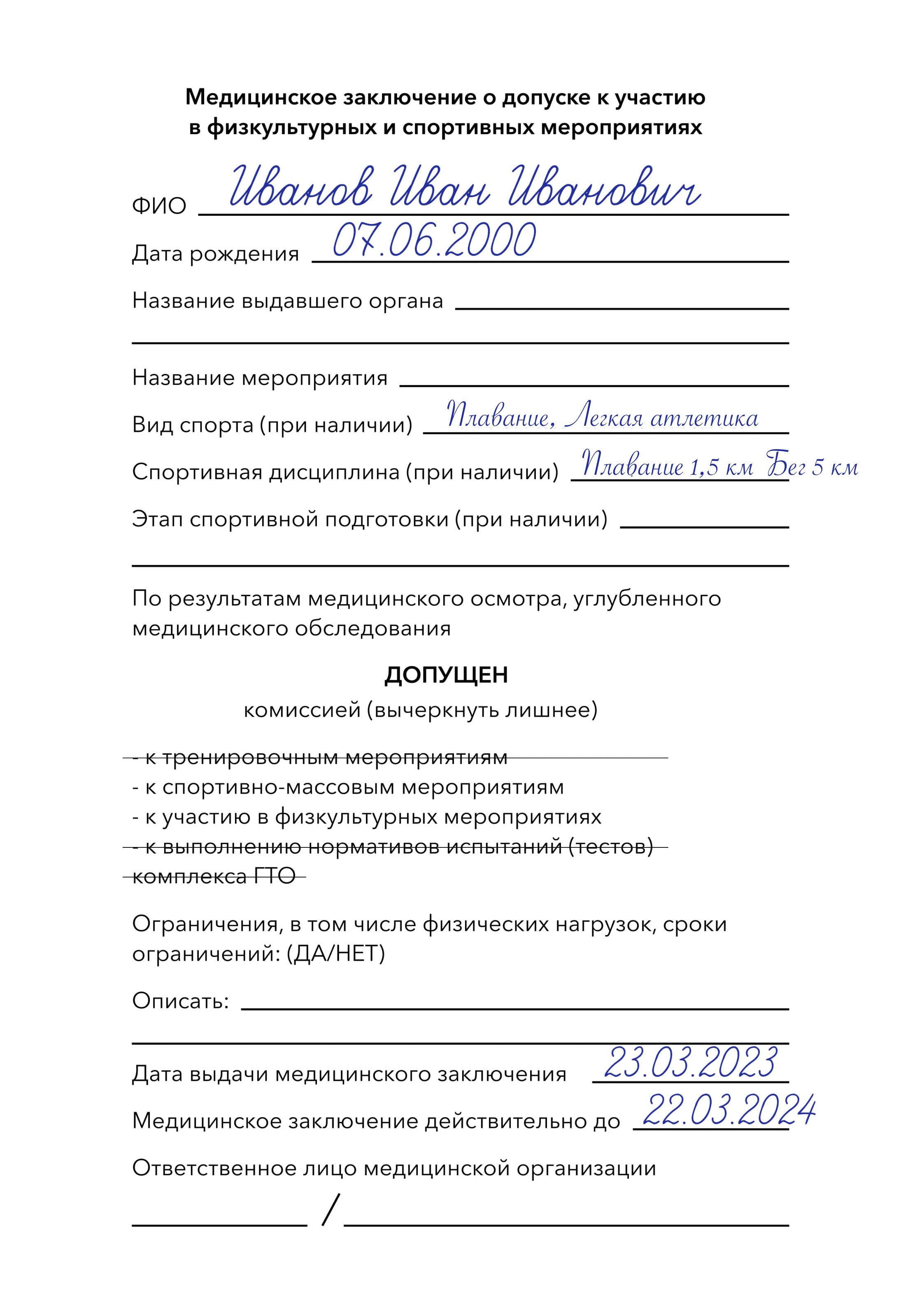 - Содержит печать медицинского учреждения, подпись и печать врача, дату выдачи, Ф.И.О участника и дистанцию, на которую допущен спортсмен;